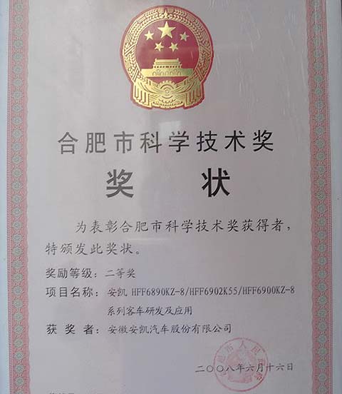 11月30日上午,合肥市委、市政府在市政务中心小会堂召开全市推进自主创新暨合芜蚌自主创新综合配套改革试验区建设动员大会。会议表彰奖励了市创新型企业、市科学技术奖获奖项目。安徽安凯汽车股份有限公司被授予“合肥市创新型企业”称号,还荣获合肥市科技进步二等奖和三等奖等殊荣。