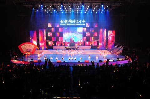 晚上7:30,大金龙2000名员工及家属、各界嘉宾共4000余人与奥运冠军张湘祥,著名歌手金海心、李丹阳、汪正正等在厦门嘉庚体育馆,用一场精心准备的庆祝晚会将大金龙20周岁的华诞推向高潮。会上,大金龙董事长孙建华、总经理江世煌为海内外重点客户、经销商、服务商、配套商及员工代表100人颁发了金牌。最令人感动的一幕出现在江世煌总经理代表大金龙再次向四川地震灾区10位孤儿捐赠爱心款10万元,延续了大金龙因四川大地震而发起的“爱心接力”活动。