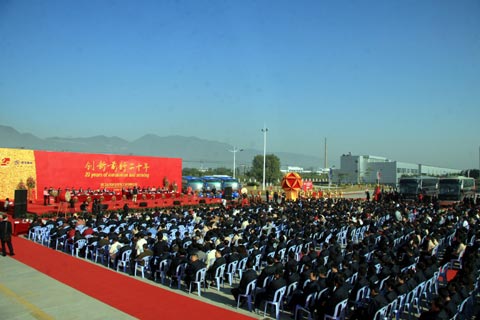 最后,伴随着所有嘉宾的浓浓祝福,承载着金龙人对未来热情,在大金龙董事长孙建华、总经理江世煌的引领下,十六位主礼嘉宾共同上台为大金龙20周年华诞剪彩,整个庆典圆满闭幕。随后,与会嘉宾在大金龙工作人员的引导下参观了大金龙生产线及20款精品车型,包括出口伊朗的18米BRT客车、机场摆渡车、豪华房车及A+海狮等车型。