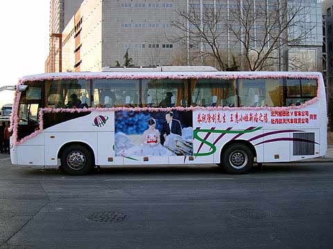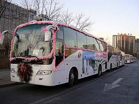 新年伊始,记者有幸参加了一场特殊的婚礼。1月11日,北京牡丹航天汽车租赁公司副总经理王凤军的两个女儿同时出嫁,而迎亲车队竟是18台福田欧V高等级豪华大巴。看惯了一排排行驶在马路上的进口轿车迎亲车队,不觉得新鲜,而18台豪华大客车迎亲,并在北京最繁华的三环路上环绕一周,不仅让人赞叹王总的精美创意,更吸引了众多北京人的羡慕眼球,为两个女儿出嫁挣足了面子,用北京人的话就是:绝对拉风!