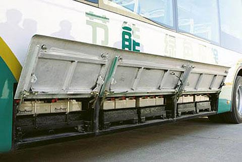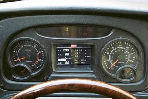 拉上高压电源开关,踩下起动踏板后客车便悄无声息地起动了。该车采用了国内成熟的油-电并联式(PHEV),该方式在20km/h的车速以下全部依靠蓄电池供电行驶,发动机并不起动,所以能大大降低排放和噪声。当车速超过20km/h时,车辆的动力系统会自动切换为燃油模式,康明斯ISDe230 31发动机很平稳地接替蓄电池为车辆继续提供与普通汽车完全一致的动力。