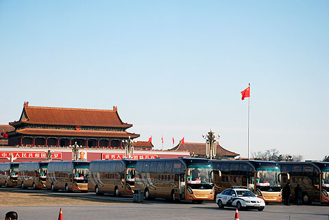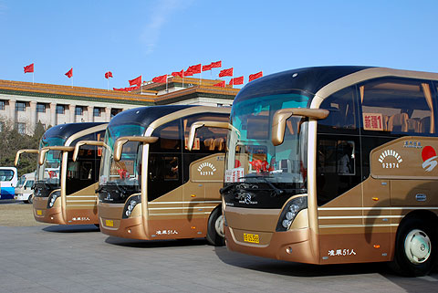 当阳光普照在它们身上时,金灿灿的车身颜色再次使其成为两会广场上最绚丽耀眼的车队,这就是服务2009年两会的22辆金旅客车XML6125J23 “开拓者”。