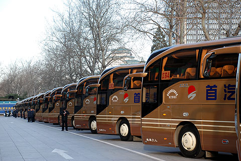 今年“两会”期间,首汽集团的金色车队凭借靓丽的外观造型和耀眼的金色“外衣”,成为所有会议服务车辆中的焦点车型,该批车型正是2007年8月首汽集团购置的厦门金旅6125“开拓者”。