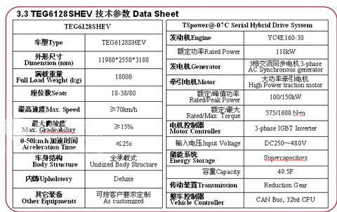 众所周知,城市公交道路工况是制动能耗最大、排放较为严重的一种工况,串联式混合动力系统是最大限度回收制动能量、将排放降至最低的一种混合动力形式。因此串联式混合动力客车应用于城市公共交通,能实现节能环保的最佳效果。TEG6128SHEV型串联混合动力客车在中国典型城市公交工况下多次研制的精品,其节油率≥ 30%。