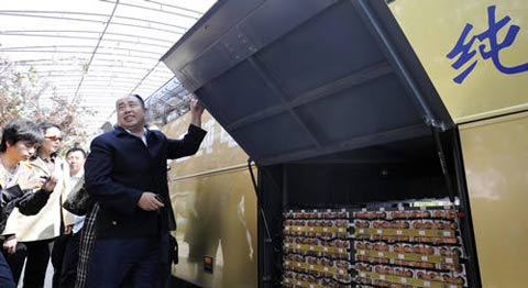 2009年4月16日,保康青山能源研究所所长曹青山(右)在介绍安装在大巴行李舱的蓄电池。