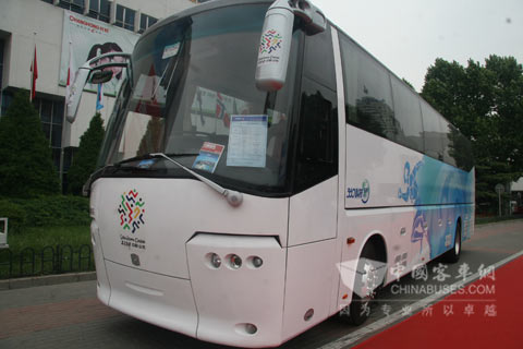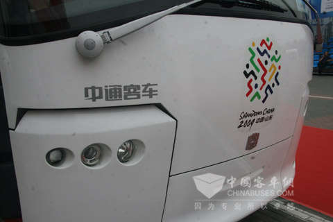 另外,记者在展会现场注意到,该款展车曾经为服务奥运会专门设计的独特图案,已经更换成新的图案:蓝白相间的车身上,绘着一个“360度科技节能神州行”的图标。据中通客车企业管理部副部长李笃生告诉XINGKONG.COM记者,2009年,为了更好地实现企业节能环保发展之路,中通客车结合自身优势提出了“科技节能领航者”的品牌发展思路,并于5月8日,在山东济南启动了“360度科技节能神州行”巡展活动,要以自身掌握的先进技术为支撑,除了实现公司自身研发生产的节能环保外,还要从车辆选型、车辆日常管理、车辆节油驾驶等方方面面帮助客户实现360度的全方位、立体式节能经营,给客户带来真正的价值服务。