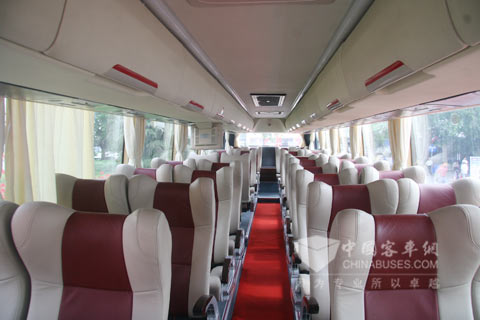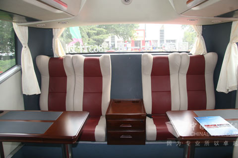 记者在展会现场试乘该车时发现,无论在车辆启动、转弯或者运行过程中,该车都十分平稳,且几乎听不到任何车辆噪音,更别说有普通车辆的发动机噪音和车身震动了。另外,车内装饰豪华,航空行李架,真皮座椅,外加小型办公桌,不但乘坐舒适,也适合各种办公和商务洽谈。
