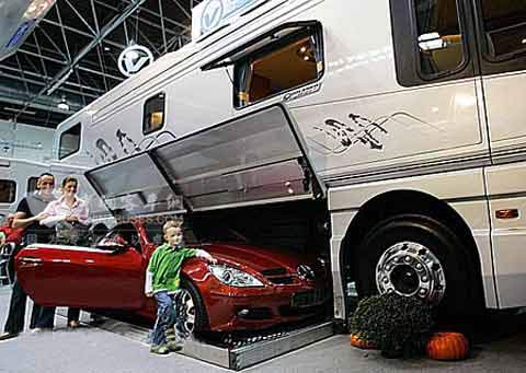 你们是否注意过在我们国家的公路上有多少辆被房车拖带着的土星Saturn?原因是因为绝大部分的土星Saturn是小型汽车,它们无须安装润滑油泵来传输传动油以便可以在地面上被四轮拖曳前进。问题是在一般情况下,大部分足可以拥有一辆高级RV娱乐旅游车的有钱人才不愿意这样拖着Saturn出丑呢。德国RV车制造商Volkner Mobile已经为这个问题找到了一个解决方案。这就是目前正在德国杜塞尔多夫举行的国际旅行车展(International Caravan Fair)上展出的一辆大巴车。