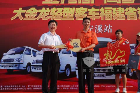 2009年6月6日,“金龙心•闽乡情”大金龙轻客(厢式货车)下乡福建省巡回活动在泉州市安溪茶都举行。本次活动中,大金龙共携带旗下9款精品A+海狮轻客及多功能厢式货车同台亮相。在现场工作人员不仅向当地民众详细介绍了国家“汽车下乡”相关政策,还为当地民众奉献了一场精彩的文艺演出。最后活动在茶都民众热烈的掌声中结束。