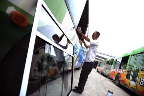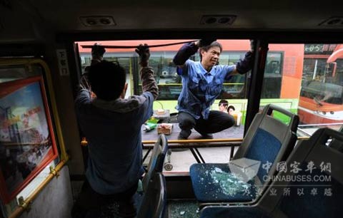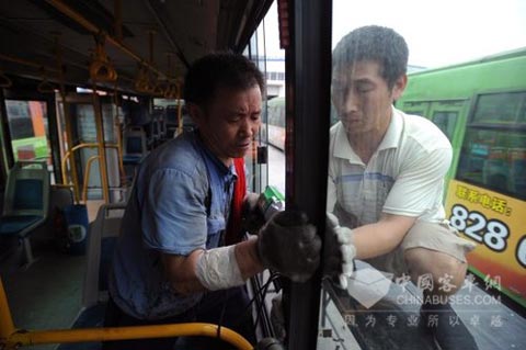 6月13日,在成都市客车厂,工人正在清除原车侧窗。