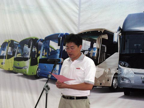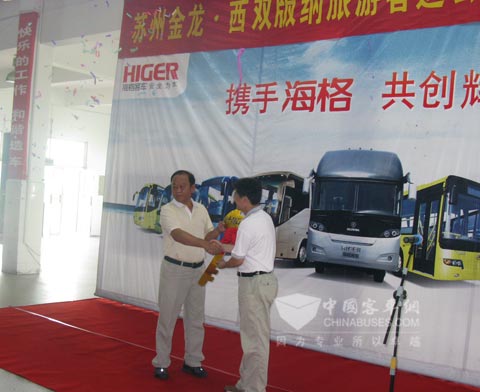 上午9:38,苏州金龙为西双版纳客运公司举行了新车发车仪式,苏州金龙执行董事张志浩代表海格客车向朱总一行表示欢迎。随后朱雨田总经理也表到了对苏州金龙长期以来的支持表示感谢。9:58,苏州金龙张志浩董事向朱总赠送了金钥匙,并举行了新车揭幕仪式。