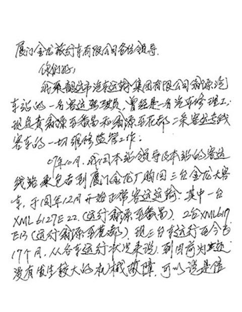 2009年5月中旬,厦门金旅收到了一封特殊的信件,这是一封客户的表扬信。信中客户对金旅客车过硬的品质和优质的售后服务给予了充分的肯定。寄信者黄姓师傅是一名负责翁源至番禹和翁源至花都两条客运专线的维修监管人员,他在来信中说,07年10月从金旅公司购回3台大客车,其中2台XML6117E13(翁源至花都运行)、1台XML6127E22(翁源至番禹运行),运行至今已经有近18个月了,到目前为止,各车辆的运行状况都十分良好,没有发生较大的机械故障,这不仅提高了他们公司的客运效率,更为他们的运营带来了可观的收益。对此,黄师傅高兴地称:“金旅客车真的是品质过硬,信得过的优质客车,不愧为中国名牌”。信中,黄师傅还结合车辆的实际行驶情况和自己的工作经验给金旅公司提出了宝贵的意见。