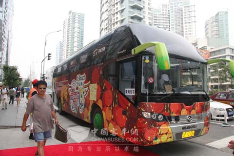 原来这辆如此拉风的豪华大巴是黄海汽车专门为天津卫视《声震八方》大型活动提供的巡演大巴。该车型号为DD6129K02,是黄海汽车2009年最新版的豪华旅游客车。