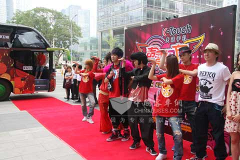 下午13:30分 ,一辆浑身涂满彩色图案的豪华大巴在众人的注视下缓缓驶上背景版前的红地毯。它色彩鲜艳的车身喷绘,大气时尚、动感十足的整体造型立刻引来在场媒体记者的关注。顿时,现场镁光灯频闪。