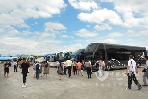 随后考察团一行还参观了金旅09年新产品,详细了解了各车的性能、配置情况。其中,以“安全、耐用、低油耗”为诉求,融入全承载车身、六项节能优化技术等造车理念的XML6146双层产品更是吸引了考察团各成员的眼球,感叹金旅客车果然名不虚传,并频频与之合影留念。