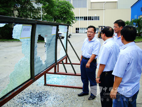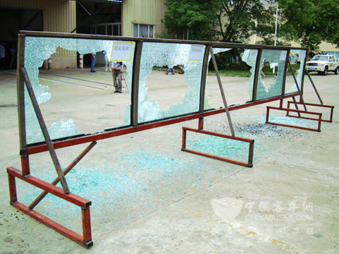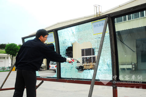 近日,厦门金旅公司在重视客车安全设计和制造的同时,特别组织专业技术人员模拟客车发生险情时的各种逃生试验,其中一项为砸玻璃试验,目的在于检验安全锤应砸在车窗玻璃的哪个位置,才能在遇险时又快又有效地砸碎玻璃,安全逃离现场。当天,在试验现场工作人员分别对着车窗玻璃的“安全出口”标识、中间和边缘处进行敲击试验。据技术中心孙秋林主任介绍说,车用玻璃一般使用特殊工艺制成的钢化玻璃或中空玻璃,耐防撞,抗击打。但若遇险,可用车内配备的特制尖嘴安全锤砸向贴有“安全出口”标识的玻璃逃生。通过验证,尖嘴安全锤只须重击有“安全出口”标识的车窗玻璃任何位置两次就能使车窗玻璃破碎,然后用脚猛踹贴有“安全出口”标识处,即可为乘客赢得逃生窗口,但需要注意的一点是贴有“安全出口”标识的标贴位置,玻璃因为胶膜的原因,相对比较难以破碎。