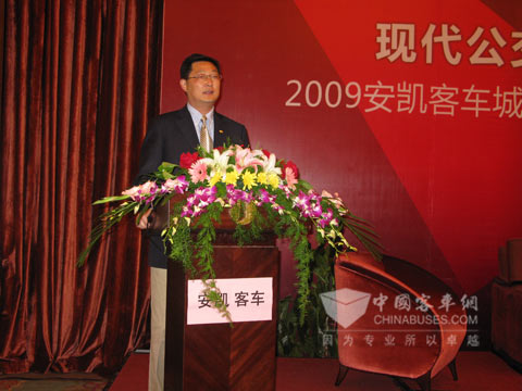 安凯客车董事长王江安在致辞中谈到:“安凯客车始终把安全、节能、环保作为公交客车技术研究的核心,产品至今已覆盖8——18米各种能源客车,除常规能源公交车外,还包括CNG、LNG、混合动力、纯电动等新能源公交客车,在上海,北京,广州,合肥,深圳,南宁,乌鲁木齐等几十家大中城市等地运营。安凯公交车有几个特点:其一是采用全承载车身设计,使得整车具有更高的安全性;其二通过优化发动机和传动系以及附件系统的匹配,使得整车具有更好的燃油经济性;其三安凯公交车设计更加注重人性化,在空间、视野、噪声、上下车等细节方面充分满足客户要求。”