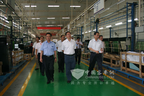 恒通客车董事杨茂超(右一)、总经理罗邦初(左一)陪同李俊市长(中)一行在总装车间参观