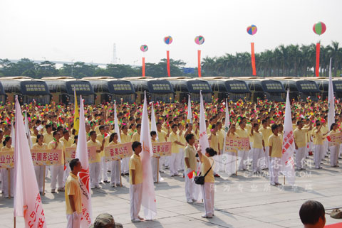 活动现场1400多名二汽职工尽情挥舞手中的亚运旗帜,郑重宣誓“从我做起,当好交通排头兵,全力以赴,为亚运服务!”交接仪式后,50台身披大红花的青年“欧洲之星”精品旅游车从广场中心徐徐驶离,奔赴云台花园、创展中心、沿江路亲水台三个活动分会场,在市区形成五道靓丽的流动风景线。