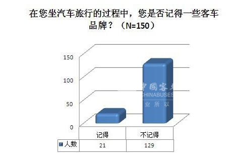 在近200名被调查的乘客中,共有150人对“您是否记得一些客车品牌?”发表了看法,其中,表示记得只有21人,仅占总人数的14%;同样在152人回答的“是否有一些客车给您留下深刻的印象?”中,表示有的只有16人,仅占总人数的11%。