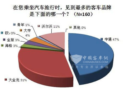 在另一项关于最常见的客车品牌的调查中,结果具有明显的差异性,在回答问卷的160人中,选择宇通、大金龙、沃尔沃这三大客车品牌的人数占到了88%,其中,选择宇通最常见的人数占总人数的47%,选择大金龙最常见的人数占31%,选择沃尔沃最常见的人数占11%,而选择海格、金旅、大宇等其他国内外客车品牌的人数还不到总数的12%。