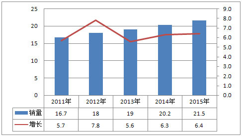 2011年-2015年中国汽车销量预测 单位:万辆,%