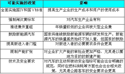 十二五期间,我国将对汽车行业实施国Ⅳ甚至国Ⅴ以上的排放标准要求,这对汽车生产企业来说,将大幅提高生产成本。部分生产技术落后的企业很可能被兼并或淘汰。同时,国家将继续推进汽车行业的重组。