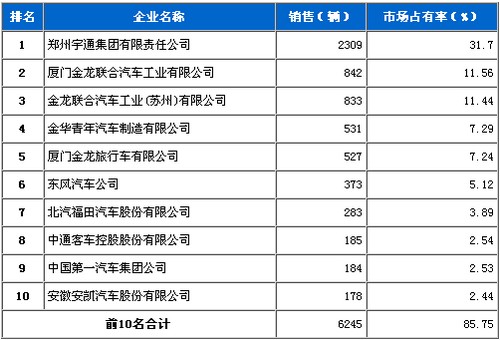 2011年1月大型客车企业销量前十名如下: