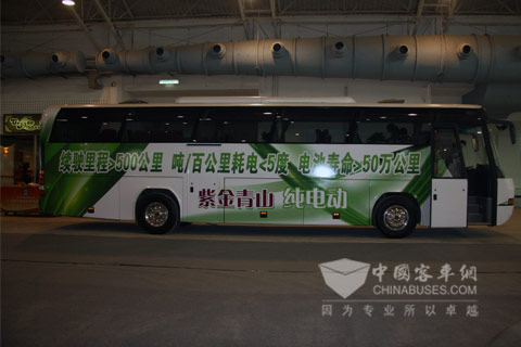 “续驶里程>500公里,每吨百公里耗电<5度,电池寿命>50万公里”在“2011中国国际新能源汽车产业促进推广周”现场,这款紫金青山纯电动客车,引来众多业内人士围观。