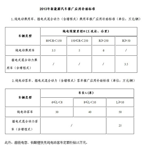 (四)补助标准。补助标准依据新能源汽车与同类传统汽车的基础差价确定,并考虑规模效应、技术进步等因素逐年退坡。2013年具体补助标准见附件。2014年和2015年,纯电动乘用车、插电式混合动力(含增程式)乘用车、纯电动专用车、燃料电池汽车补助标准在2013年标准基础上分别下降10%和20%;纯电动公交车、插电式混合动力(含增程式)公交车标准维持不变。