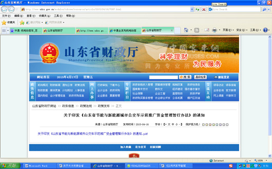 为进一步扩大公共服务领域新能源、清洁能源汽车应用规模,保护环境、节约能源,近日,山东省财政厅出台《山东省节能与新能源城市公交车示范推广资金管理暂行办法》,该办法对本省公交企业采购新能源公交客车进行了财政支持,对补贴额度、补贴审领程序进行了系统规定,该办法的出台,成为山东省实施节能减排,推进绿色公交发展的又一里程碑。