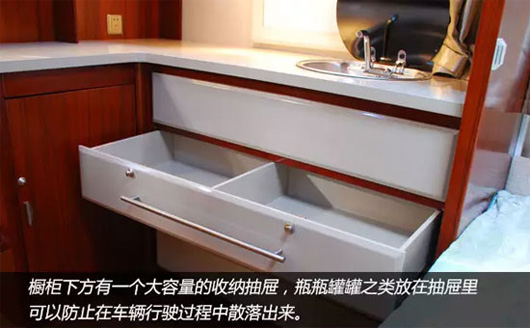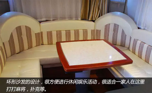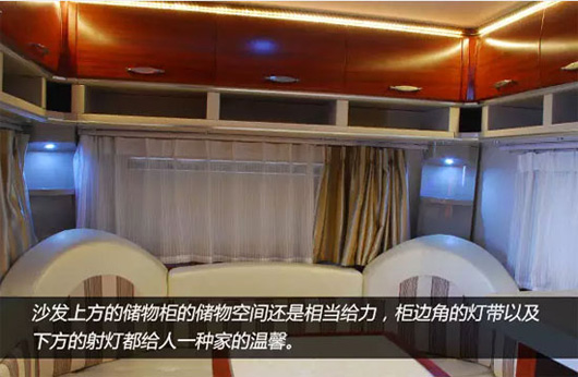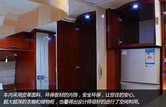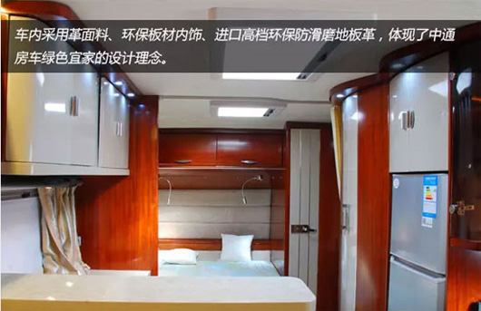 车辆家居内设豪华双人床、环形沙发、整体吊柜、整体橱柜、整体卫生间、豪华淋浴装置、冷暖空调等设施,充分考虑房车旅游露营生活需要,满足房车露营便捷、娱乐的需求。车内皮革面料、环保板材内饰、进口高档环保防滑磨地板革,体现了中通房车绿色宜家的设计理。