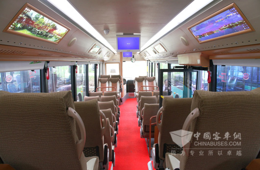 车身均采用珍珠红色、全景大玻璃、人性化低踏板、舒适的航空座椅、视频播放系统、免费WiFi、车载GPS系统、家庭共享区、专用服务台、一对一多国语言讲解等,在低碳环保的高科技装备之下,尽显古典和现代交融的苏式风情。