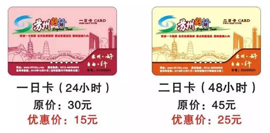 一日卡原价30元,优惠价15元,首次刷卡后,24小时内有效,运营时间内,可任意乘坐“苏州好行”旅游观光巴士和换乘苏州市区公交。