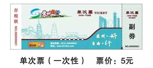 单次票每张5元,采用纸质票的形式,一次有效,无法换乘“苏州好行”旅游观光巴士和苏州市区公交。