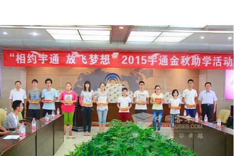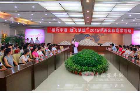 为帮助寒门学子顺利走进大学,2015年8月20日下午,在十八里河宇通工业园行政楼六楼,100名准大学生从河南省各地相聚郑州市宇通客车股份有限公司,参与“相约宇通放飞梦想”第十届宇通金秋助学捐助仪式,接受了总额为50万的助学金资助。