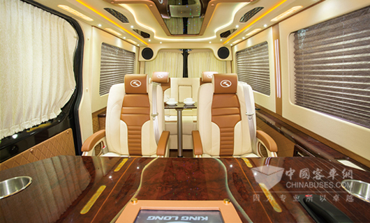 金龙凯歌商务车被外界誉为“时空超人的陆地商务舱”,不仅宜家,并且宜商。何谓“宜家”?家的氛围延伸到车内。整体式侧窗隐私玻璃,隔绝喧嚣,静谧安逸;安稳舒适的皮质沙发,伸展释放疲惫感;车载电视、DVD播放及小冰箱配置,惬意暖心。何谓“宜商”?事业造就于路上。车厢采用吸音材质,铺设实木地板;顶部缀饰满天星氛围灯,氛围柔和高雅;独设立式酒柜,崇尚举杯品酒的成功。