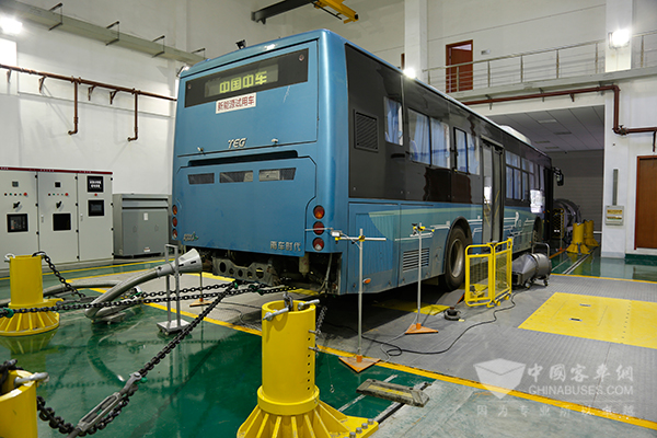 当然,在中车电动的技术专家们看来,可靠性试验远不止这些指标的检测,为此,中车电动投巨资建立了由底盘测功机、冷却系统、尾气排放系统等组成的整车综合性能试验台,通过电惯量模拟机械惯量为整车试验提供持续牵引力,进行整车动力性、经济性、热平衡等试验,这样可以对每一款车型进行更系统全面的分析,来提升整车的可靠性、经济性。小编偷偷瞄了一下试验台的设备铭牌,了解到该试验台基础惯量5000kG,持续牵引力可达42000Nm,最大转毂速度150Km/h。