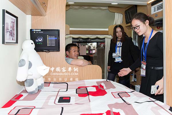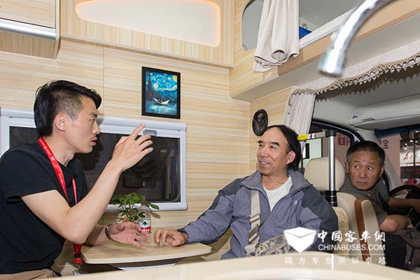 海格工作人员在为摄影师们介绍C型房车各项性能 据海格工作人员介绍,此次参展的自行式C型房车,车内格局为温馨紧凑的两室一厅,车门造型与家庭式房门相类似,右侧车顶上方还有一个手摇自卷式遮阳棚,便于家庭郊外野餐、亲友聚会。内饰运用仿胡桃木饰板与拼色设计,车中客厅部分提供两个相对的真皮座椅,并设有安全带,兼顾舒适与安全。卧室部分则用布帘分隔,形成独立空间,车中吊顶部分加装灯带,可变色的氛围灯,带来温馨家庭情调。车内厨房部分,冰箱、电磁炉、电热水壶一应俱全,能满足较为舒适的生活需求。卫生间配备一体式马桶、化妆镜和不锈钢洗漱池。由于该车车身长度未达6米,且登记为6座版车型,所以C1驾照即可驾驶。这款自驾式房车各类设施一应俱全,完全可以满足摄影人外出创作的需求。