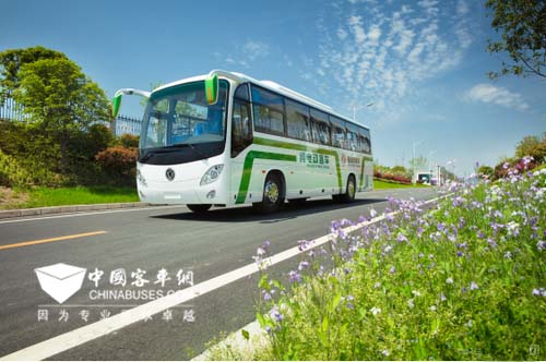 东风纯电动通勤客车采用自主开发的插电式混合动力客车控制器硬件,控制策略作纯电动开发,增加电池及相关核心电动附件,并制定电动汽车驱动系统及辅助系统硬件框架。主要技术特点:配置G-Link智能监控系统,360度视野全车监控,具有高度的安全性能;动力系统采用电机直驱方式,无变速箱,操纵方便,行驶平顺性能好。选用低噪电机、电动空压机和电动转向泵,整车行驶安静舒适;自主研发的再生制动系统,通过气压调控,既保证了制动安全性和平顺性,又最大限度的将制动能量通过电机转化为电能,制动能量回收效率高,经济性好,百公里电耗40kwh,大大提高整车的经济性。同时整车全车采用了多项轻量化技术,减轻了整车整备质量,降低了整车耗电量。