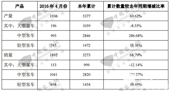 中通客车2016年5月6日晚间发布产销快报显示,公司2016年1至4月累计实现客车产量5377辆,同比增长69.62%;累计销量5273辆,同比增长68.79%。其中,公司4月份产、销量分别为1936辆和1892辆。