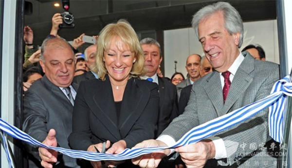 乌拉圭总统(右一)及乌拉圭工业能源部部长(中)为比亚迪纯电动大巴正式运营剪彩