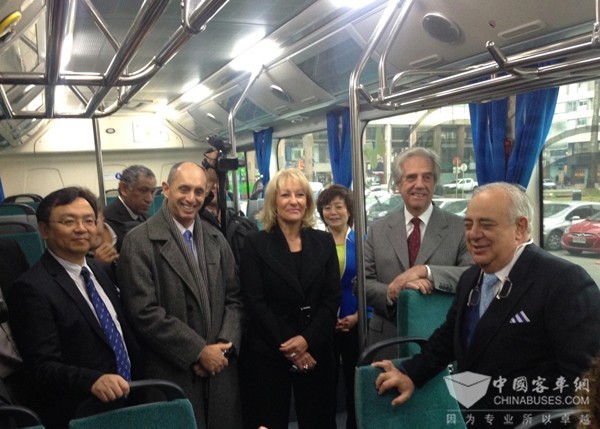 乌拉圭总统(右二)携工业及能源部部长(左三)以及乌拉圭最大电力公司主席(左二)共同乘坐电动大巴