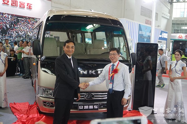 安凯客车董事长戴茂方和交通运输部科学研究院党委书记周晓航共同为宝斯通K7新车上市揭幕