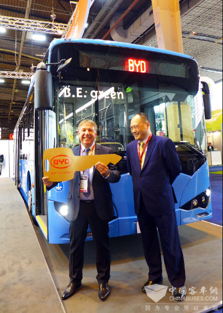 比亚迪随后与运营商B.E. green举办了法国首台纯电动公交客车的交付仪式。就在上个月,B.E. green的创始人Patrick Mignucci前往中国深圳参观了比亚迪全球总部,现场就与比亚迪签下一批K9和C9的订单,并称赞道:“参观比亚迪总部之后,我对这个世界一流的电动大巴生产商的产品质量和可靠性深信不疑。”“我很期待第一辆比亚迪12米电动大巴在2016年九月份开始运营。”