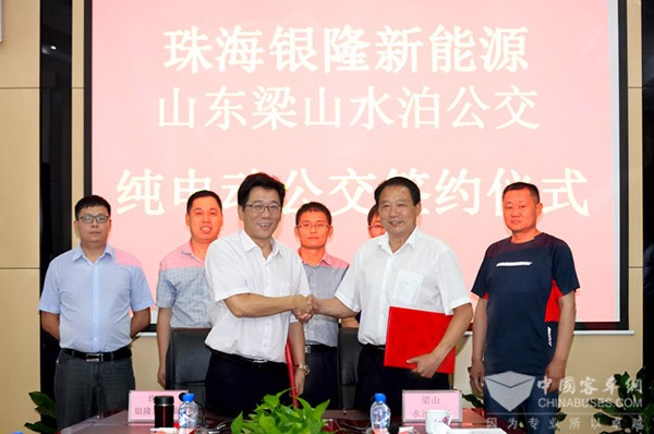 珠海银隆新能源&梁山水泊公交纯电动公交签约仪式(二) 2016年6月16日下午,珠海银隆新能源与山东省梁山县水泊公共汽车有限公司(以下简称梁山水泊公交)就60台纯电动公交订单达成协议,集团副总裁敖建华与梁山水泊公交董事长梁传友签订了合约。银隆新能源自产业化投资以来,将世界领先的“钛酸锂”技术广泛应用于新能源汽车的研发与制造领域,构筑了强大的品牌与市场竞争力。为配合山东省推进城区建设及旅游业的发展,加快城乡一体化进程,实现城乡公交一体化,通过前期调研,梁山水泊公交选择了银隆纯电动新能源公交,达成了本次合作。
