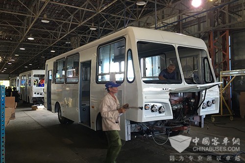当地时间2016年6月21日上午,在宇通古巴合资工厂CAISA,工人们正在紧张地工作。自2005年起,宇通客车与该厂开展合作,帮助培训技术工人,建立企业管理体系,对每个生产环节进行技术指导。