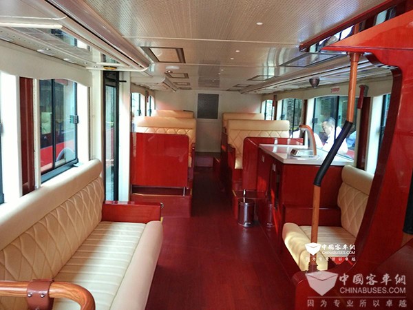 其次,看配置。豪华奢侈有内涵的内饰不胜枚举。一层前半部分设置有当地风土民情特产的展示柜,展示柜后方左右两侧分别侧方了四人座与两人座的真皮沙发,与车身统一的正红色扶手搭配米黄色的真皮座椅,桌面上放置可调试到任意温度的饮水机。车辆后部顶置了四台屏幕,可进行影音播放,赶走长期乘车的枯燥感,屏幕是电子控制,放下与收起都十分方便。车厢最后排座椅后方还设置了物品箱,便于存放物品。车厢顶部的大屏灯光板与侧方灯群以及车床两侧的小LED灯串,不仅方便了车内乘客的乘车照明,夜晚行驶在路上,迷幻的车内灯光也成为了一道风景线。物品展示台的对面即通往二层的台阶,台阶依然沿用红色木地板质地,边缘装饰亮黄色边条以防乘客跌滑,此外,黑色橡胶包边的扶手设置的十分人性化,完全保证了乘客上下台阶的安全性。