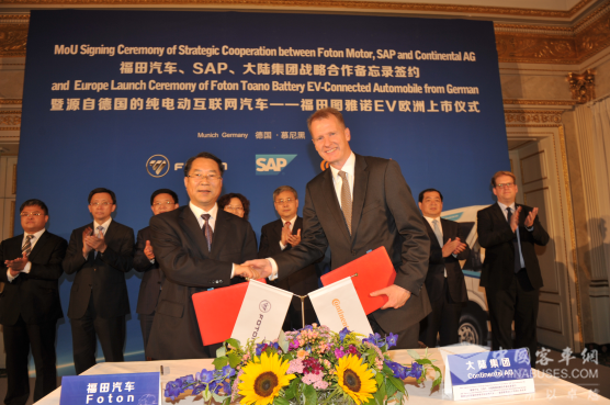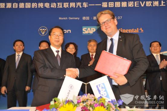 2016年7月13日,在欧洲中心德国慕尼黑,福田汽车分别与德国SAP、大陆集团签署了战略合作协议,同时,源自德国的纯电动互联网汽车——福田图雅诺EV宣布在欧洲市场正式上市,这意味着福田汽车与德国工业4.0对接有了实质的进展,也填补了中国纯电动互联网VAN类产品进军欧美高端市场的空白。