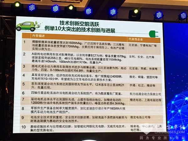 最后,要特别说一下技术创新,技术创新是我国新能源汽车发展的重要特征与希望所在。因此我特别列举了我认为很重要的十大技术创新成果在表上(下图)。技术创新是我们新能源汽车产业发展的核心,没有技术创新就没有中国现在新能源汽车发展形势。我们不能依赖国外的技术做这件事,如果我们不关注技术创新也没有中国新能源汽车未来。这点要特别在这里强调,我们技术创新在新能源汽车里面有很大成绩,我们可以看到中国人在新能源汽车里面很多是自己的东西,外国人还没有做的我们先做了,也有我们跟外国人同时起步做的,我们一点也不差,这些都是非常重要的、珍贵的。